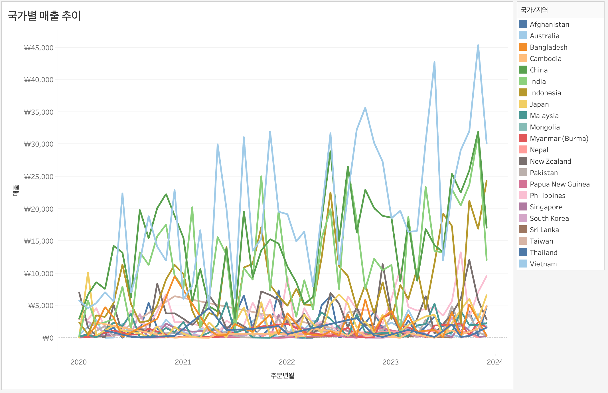 왼쪽과 오른쪽 모두 ‘국가별 월별 매출 추이'를 나타낸 차트입니다. 그러나, 시선이 어디로 집중되느냐에서는 차이가 있다는 것이 느껴지시죠? 왼쪽 그림에서는 모든 국가에 대해 서로 다른 색상으로 구분하다 보니, 오히려 그 어떤 내용에도 집중할 수 없어 시선이 분산됩니다.