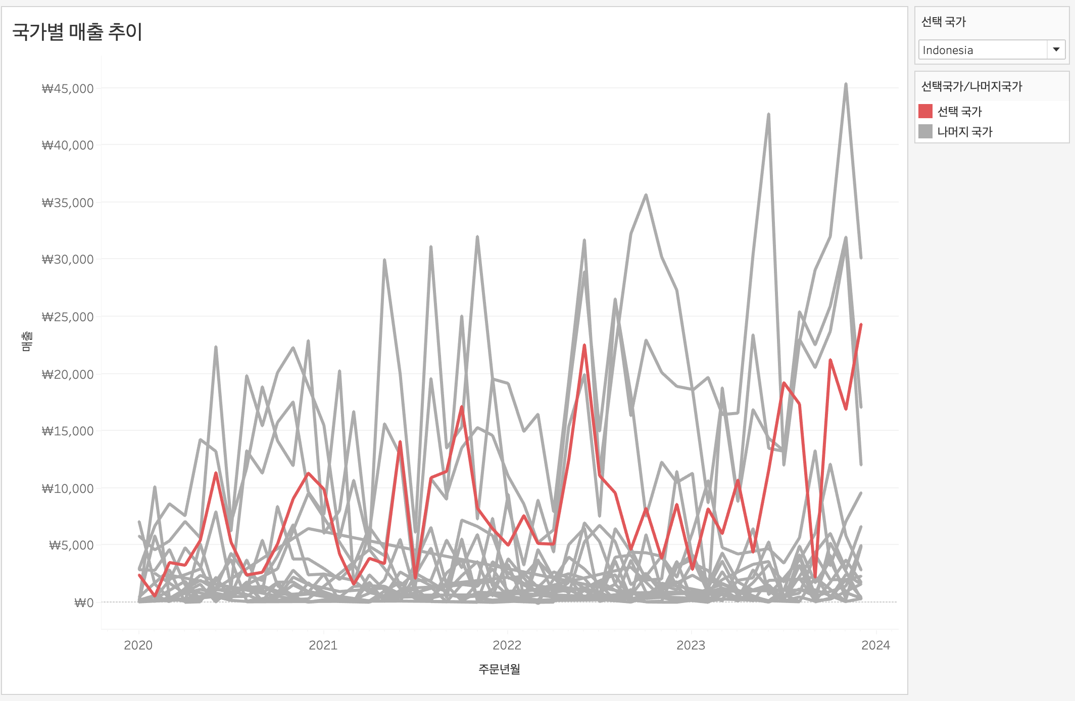 반면에 오른쪽 그림에서는 ‘강조’하여 표현하고자 하는 국가를 사용자가 동적으로 변경할 수 있는 매개변수를 활용하여 매개변수에서 선택된 국가만 ‘빨간색'으로 색상을 부여하여 확실히 시선을 집중시키고 있습니다.