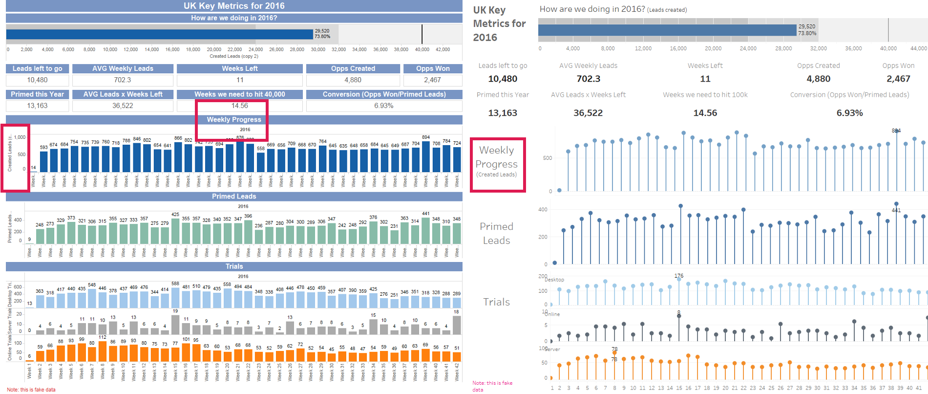 막대 차트는 언제나 옳지만, 대시보드의 중앙 부분에 색상과 요소가 너무 많아 복잡해보입니다. 대안으로 선택한 롤리팝 차트는 잉크의 사용을 줄이면서도 값의 위치를 통해 여전히 효과적으로 정보를 전달합니다.