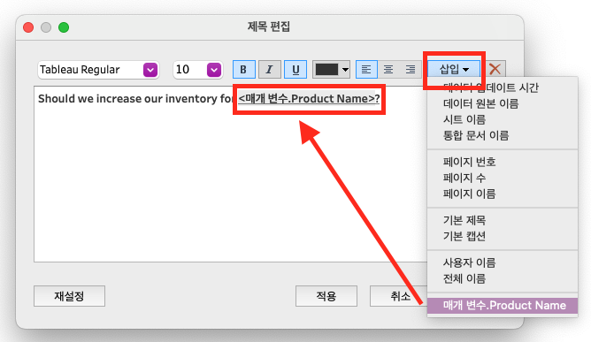 제목 편집 창에 가면 삽입 옵션 아래에서 매개변수 뿐만 아니라, 시트 이름, 페이지 번호, 데이터 업데이트 시간 등의 정보를 삽입할 수 있습니다.