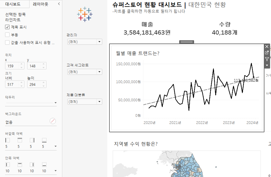 - '제품 분류별 매출'과 수익현황 차트의 색상 수정('수익'을 마크의 색상으로 설정)